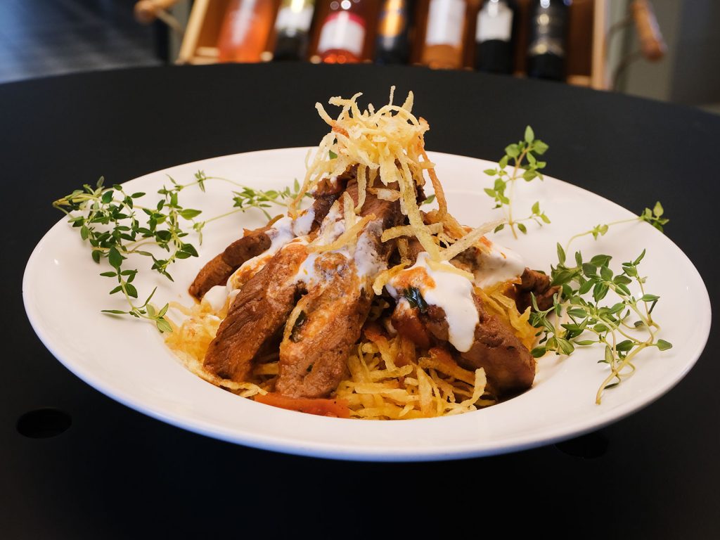 Match Potatoes, Tenderloin Slices, Yogurt and Tomato Sauce