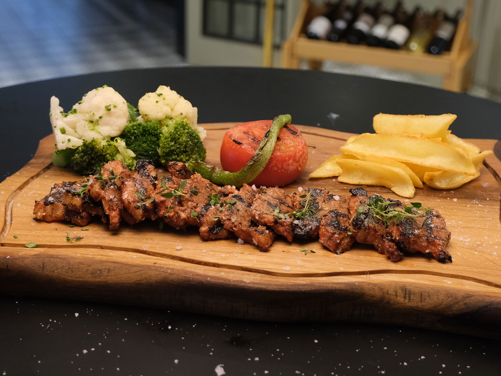 Kuzu sırtı, karışık sebze, patates kızartması, sivri biber, kekik, domates,