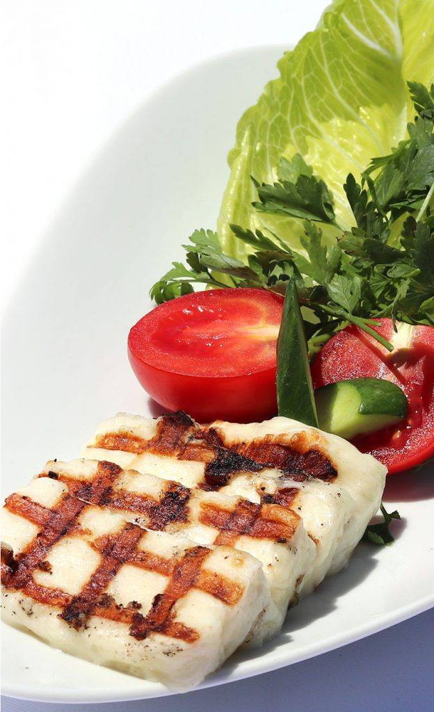 (Grilled Halloumi Cheese , Served With Green Peppers, Lettuce And Vine Tomaotes)