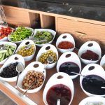 Ajvar(Spicy Vegetable Sauce), Rainsins, Salt-Cured Black Olives, Craked Green Olives, Butter, Honey, Deep Fried Cheese Rool and Gözleme (Stuffed Turkish Flatbread)