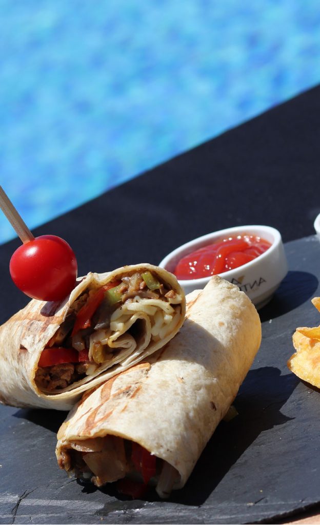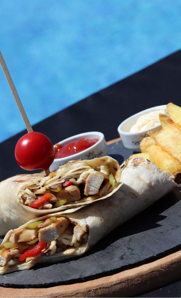 Dana kaburga, taco ekmeği, avokado sos, lime suyu, sivri biber, marul, kornişon, jelapeno biber, kibrit patates, domates